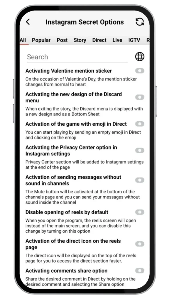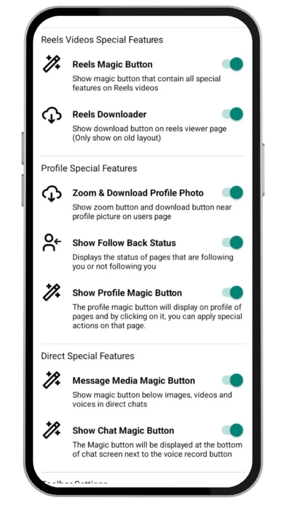 The magical button allows you to share all the magical features of videos in Reels and IGTv. It allows the reels downloader button in device storage. The direct messages and comments also contain a magic button in the chat screen and a voice recorder to enjoy the pining, avatars, and animation magic in chats.