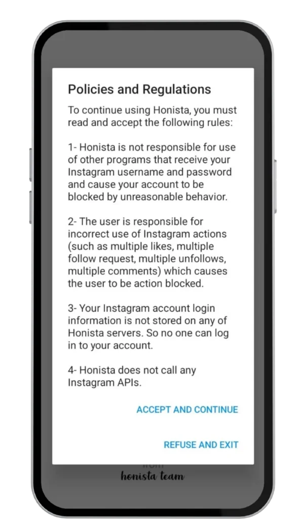 Honsita implements particular policies and regulations for the continual use of Honista Apk. Your information is not stored in Honista Servers. However, your account can block an Instagram account with unreasonable behavior and activities. Such as likes, unfollows, comments, follow requests, and shares are the responsibility of users. Users can get blocked by performing these actions on multiple bases. Moreover, the Instagram APIs are not sorted in Honsita APK, and login information and other data history are not stored for the other programs.
